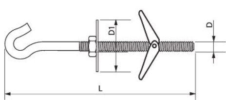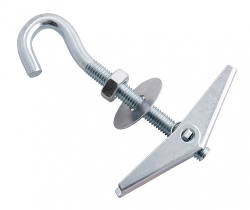 Пружинный дюбель состоит из крючка- полукольца, шпильки, складывающихся лепестков. Шпильку оснащают метрической резьбой, как правило по всему стволу. Дюбель изготовлен из оцинкованной стали. Применяют пружинный дюбель для подвеса различных конструкций к навесным потолкам, стенам из гипсокартона, где нет доступа к крепежу с обратной стороны стены.