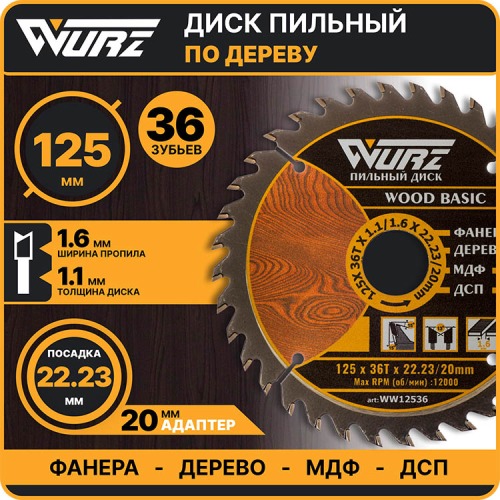 Пильные диски под брендом WURZ для обработки Фанеры, МДФ, ДСП и массива дерева заслужено пользуются спросом со стороны строительных компаний за выгодный баланс цена – качество. Пильные диски обладают повышенным ресурсом, малым шумом при работе на высоких оборотах, отсутствием вибрации, точным и ровном резом. При не высокой цене, пильный диск по дереву Wurz, используется в ручном инструменте большее количество раз, нежели большинство пильных дисков от других производителей.