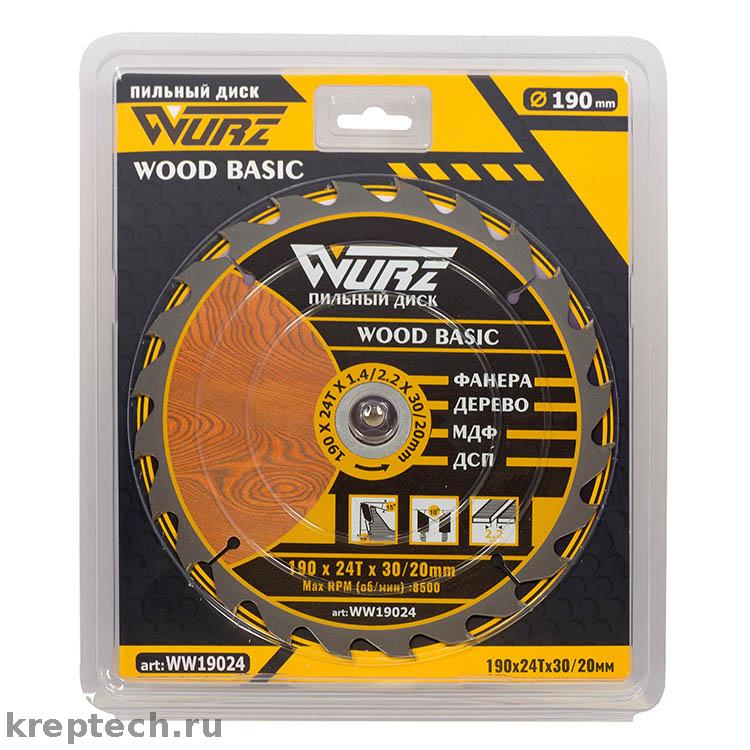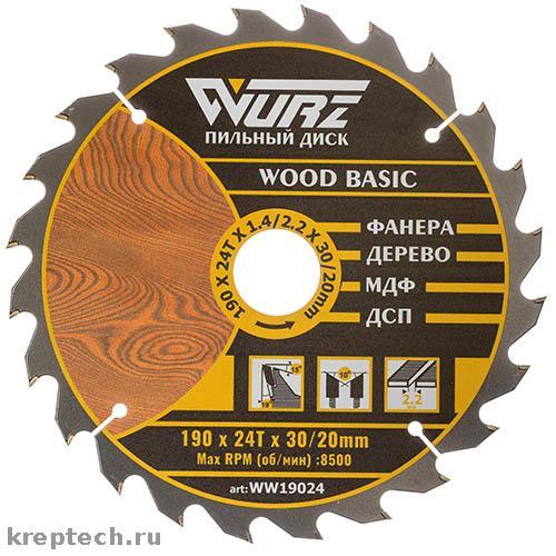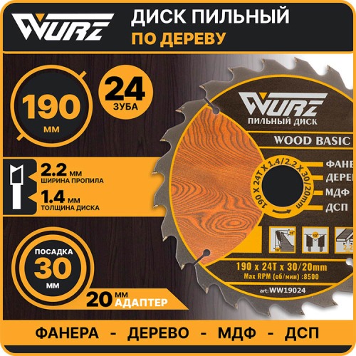 Пильные диски под брендом WURZ для обработки Фанеры, МДФ, ДСП и массива дерева заслужено пользуются спросом со стороны строительных компаний за выгодный баланс цена – качество. Пильные диски обладают повышенным ресурсом, малым шумом при работе на высоких оборотах, отсутствием вибрации, точным и ровном резом. При не высокой цене, пильный диск по дереву Wurz, используется в ручном инструменте большее количество раз, нежели большинство пильных дисков от других производителей. Диск по внешнему диаметру 190 mm и обладает по кругу 24 зубьями.