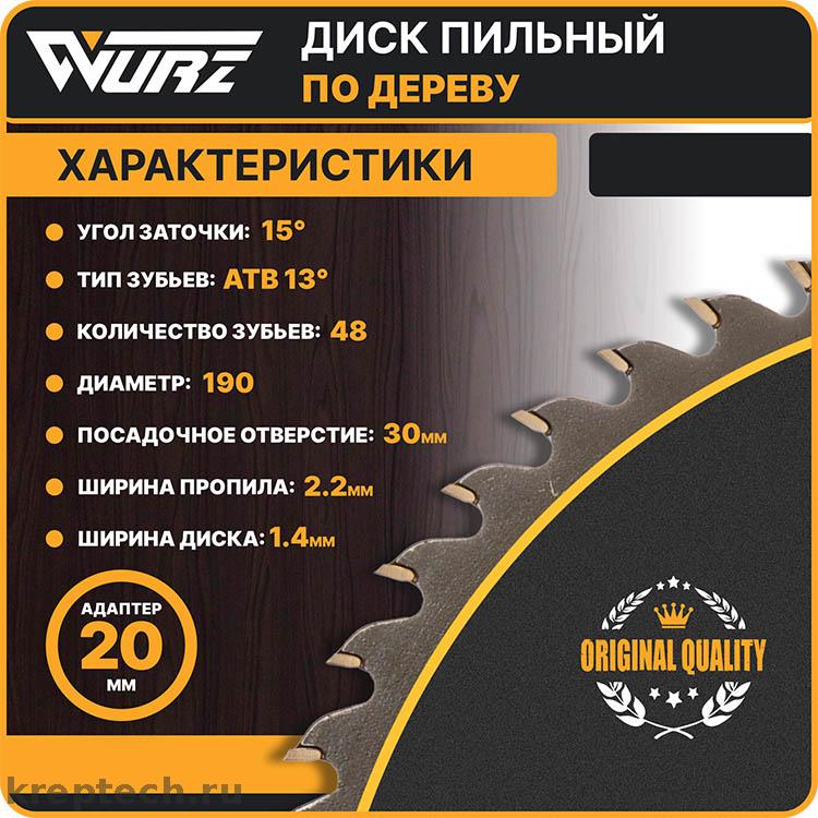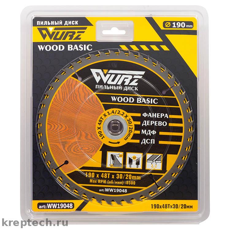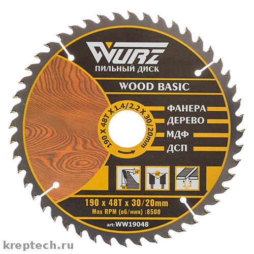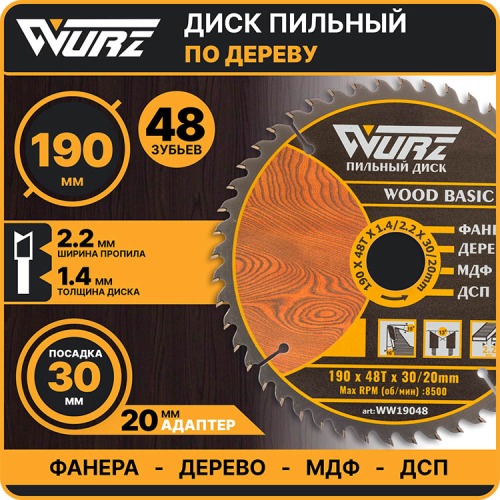 Пильные диски под брендом WURZ для обработки Фанеры, МДФ, ДСП и массива дерева заслужено пользуются спросом со стороны строительных компаний за выгодный баланс цена – качество. Пильные диски обладают повышенным ресурсом, малым шумом при работе на высоких оборотах, отсутствием вибрации, точным и ровном резом. При не высокой цене, пильный диск по дереву Wurz, используется в ручном инструменте большее количество раз, нежели большинство пильных дисков от других производителей. Диск по внешнему диаметру 190 mm и обладает по кругу 48 зубьями.