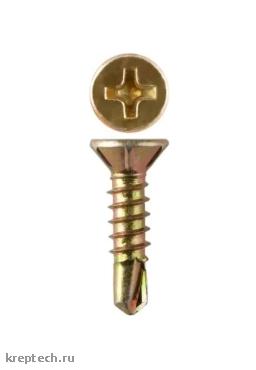 Саморез с потайной головкой, крестообразным шлицом РН 2, покрытие желтый цинк. Наконечник сверло. Головка с раззенковкой.