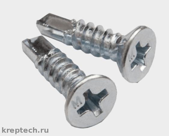 Саморез с потайной головкой, крестообразным шлицом РН 2, покрытие белый цинк. Наконечник сверло. Головка с раззенковкой.