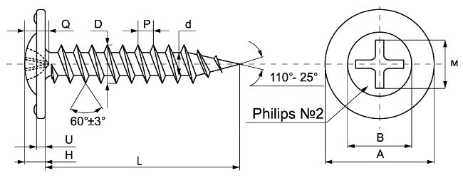 Саморез с плоской, широкой шляпкой, крестообразным шлицом РН 2, острый наконечник, мелкий шаг резьбы. Головка выкрашена в цвет черный графит (RAL 9011)
