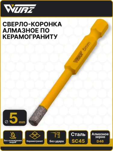 Алмазная сверло- коронка WURZ применяется при изготовлении отверстий в твердых породах природного камня, таких как мрамор, гранит, керамогранит. При этом используется самый доступный электроинструмент, такие, как дрель либо шуруповерт. Коронка располагает шестигранным хвостовиком.