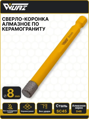 Алмазная сверло- коронка WURZ применяется при изготовлении отверстий в твердых породах природного камня, таких как мрамор, гранит, керамогранит. При этом используется самый доступный электроинструмент, такие, как дрель либо шуруповерт. Коронка располагает шестигранным хвостовиком.